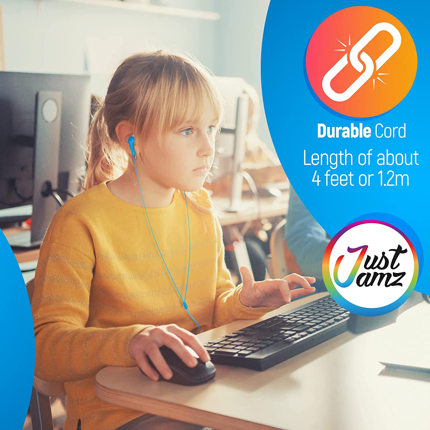 JustJamz Kidz Jelly Roll Colorful In-Ear 3.5mm Stereo Earbud Earphones - 100 Pack Offer both style and comfort while enjoying listening pleasure with the multi-color 100 Pack In-Ear Earbud Headphones. Sound Effect : In-Ear Headphones provide full vivid sound. Stylish Design : Vivid fashionable color options with color matching cords let you choose a pair that complements your outfit, accessories, and mood. Noise Isolation: The headphone comes with silicon earbuds to ensure a snug, noise isolating fit so that you can focus on the music. Cord Length: The 3ft 1M cord threads comfortably through clothing and bags.