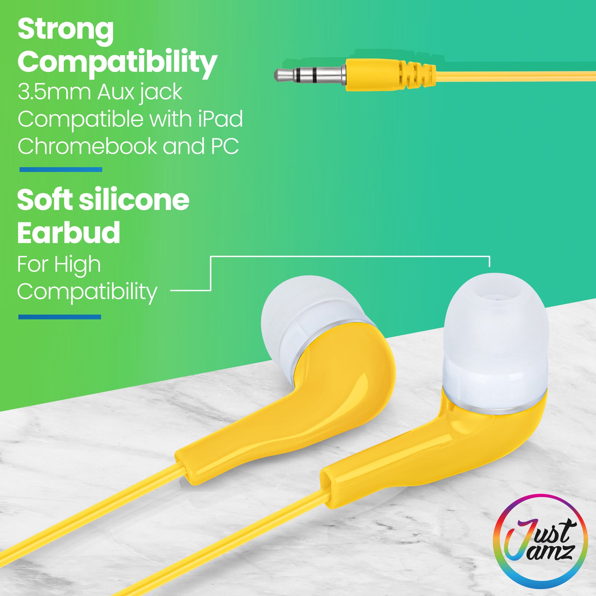 The earbuds come with silicone earbud tips and anti-tangle flat cord. These earphones with microphone have the standard 3.5 mm audio jack compatible with most devices like smartphones, tablets, PCs, and laptops (incl. Chromebooks).
