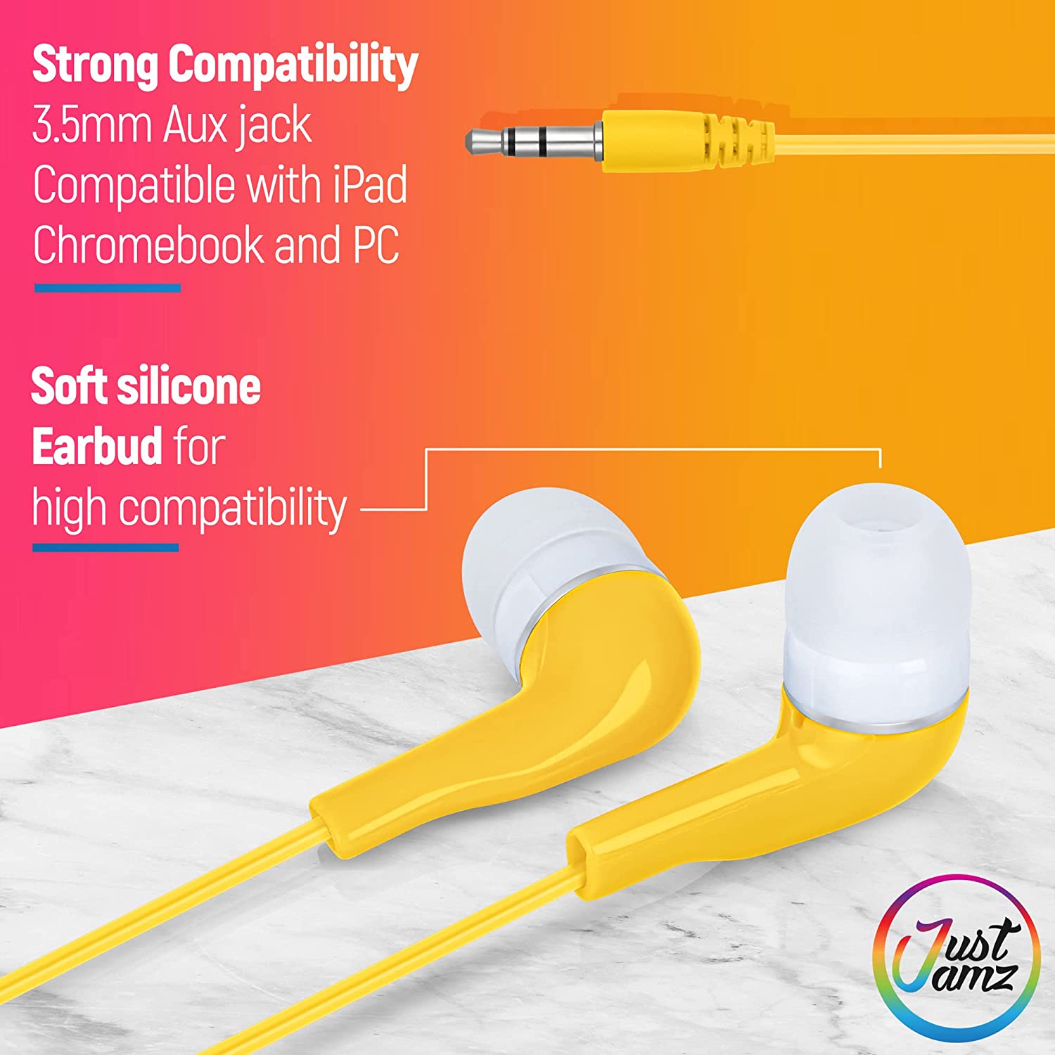 JustJamz Kidz Jelly Roll Colorful In-Ear 3.5mm Stereo Earbud Earphones - 100 Pack Offer both style and comfort while enjoying listening pleasure with the multi-color 100 Pack In-Ear Earbud Headphones. Sound Effect : In-Ear Headphones provide full vivid sound. Stylish Design : Vivid fashionable color options with color matching cords let you choose a pair that complements your outfit, accessories, and mood. Noise Isolation: The headphone comes with silicon earbuds to ensure a snug, noise isolating fit so that you can focus on the music. Cord Length: The 3ft 1M cord threads comfortably through clothing and bags.
